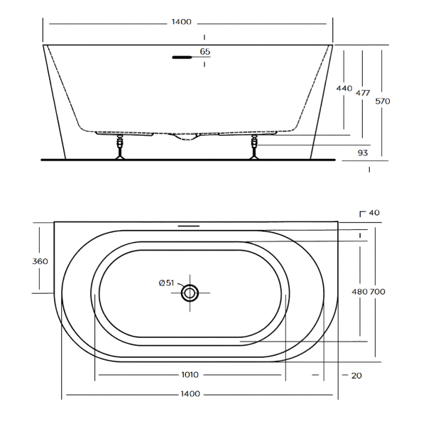 Oceano 1400mm Back to Wall Bath with Overflow - White Gloss